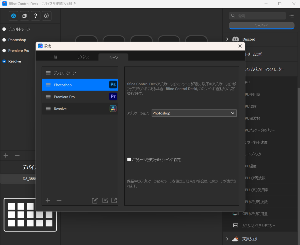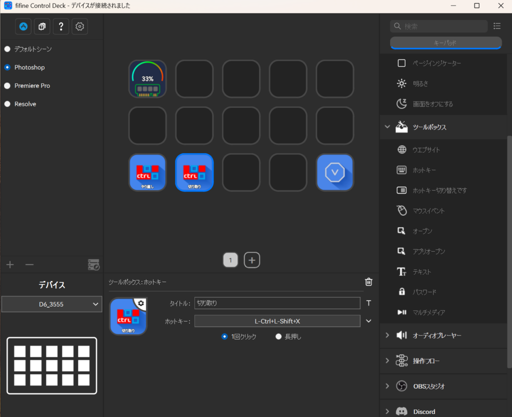 UIは上記のようにシンプルなものであり、普段利用しているアプリショートカットをfifine Control Dockの任意の空欄にD&Dするだけ。