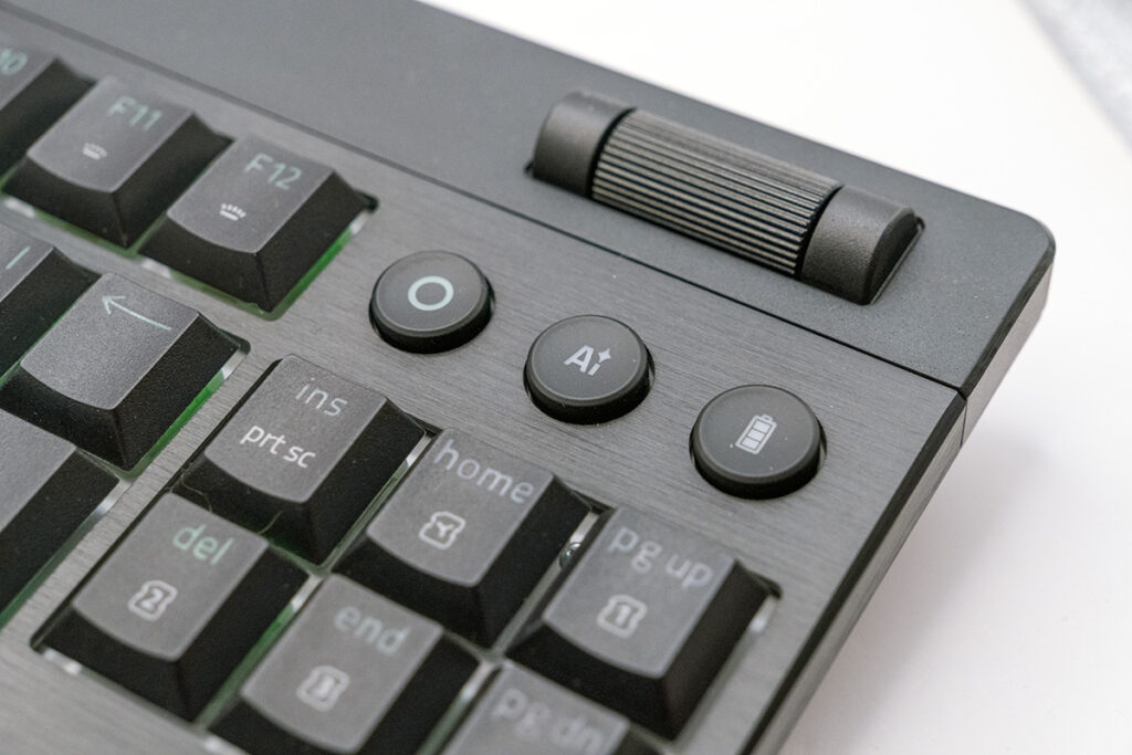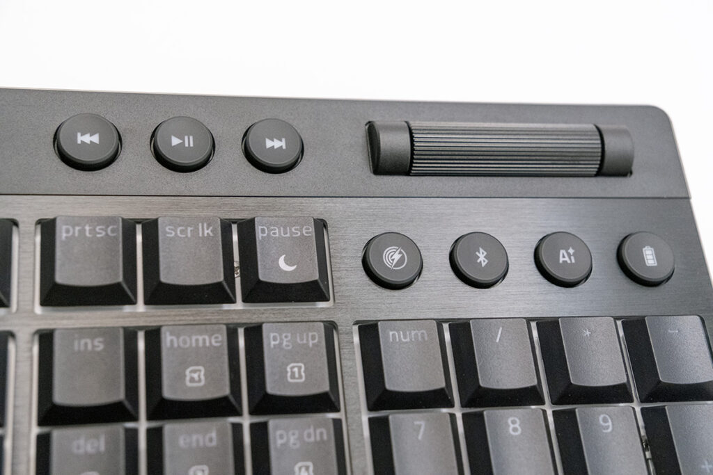 キーボード右上に、再生/一時停止などを操作できるメディアボタンと、音量を直感的に調整できる多機能ローラーを搭載。
