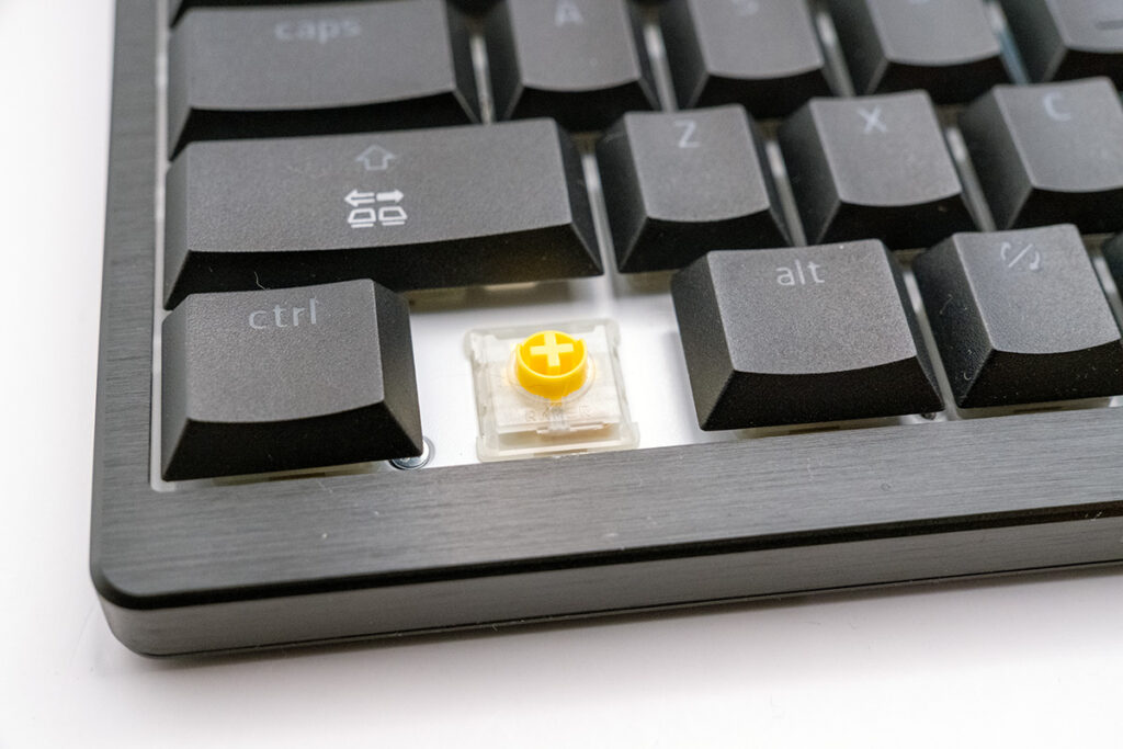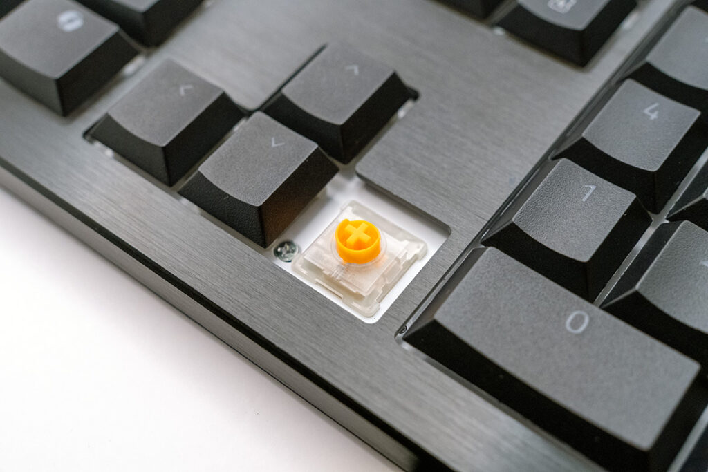 クリッキー(グリーン軸)、タクタイル(オレンジ軸)、リニア(イエロー軸)といったバリエーションがあり、好みの打鍵感を選択可能。