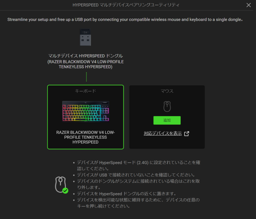 HyperSpeed Wirelessモードは2.4GHz帯を利用しており、マルチデバイスペアリング対応マウスがあれば同一のドングルで一緒にペアリングができるため、USBポートの節約が可能。